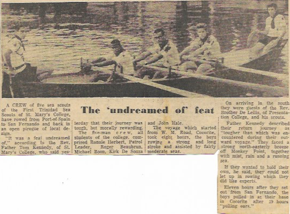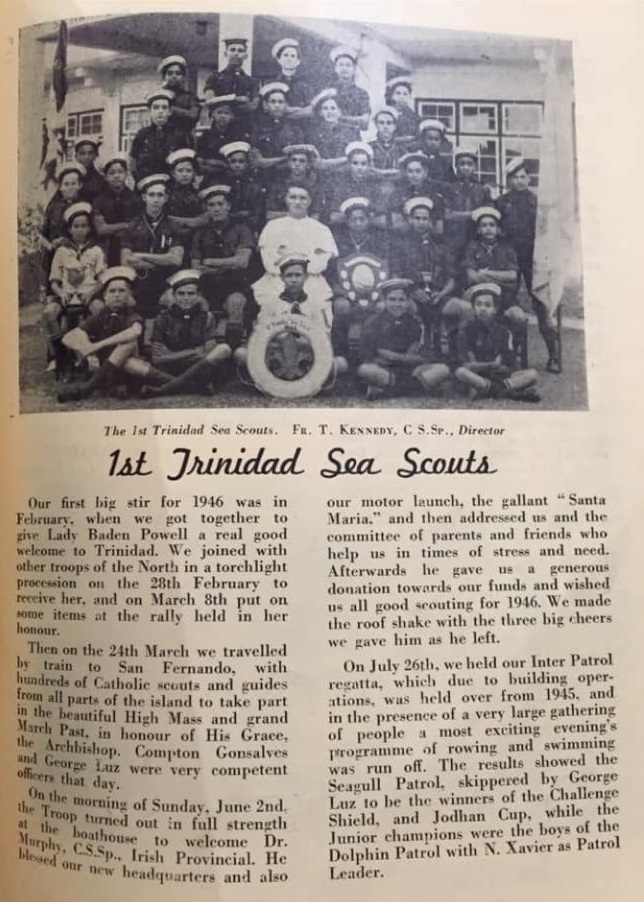 St. Mary's College was famous for its rowing teams, in the early 1920's. Two past pupils, John and James Sneddon were the expert and dedicated coaches. Seeing the success of the team over the years, there were many proposals and discussions about the possible formation of a Boating Club and as to its form and working. A number of St. Mary's boys were members of the 9th Port of Spain Troop (attached to St. Patrick's parish) and Fr. English, a priest at the College, who had contact with this group realised the possibilities waiting to be tapped at the College. With his strong encouragement, it was finally decided that the new College Club would follow the rules and regulations of a Sea Scout Troop. At its beginning the Scoutmaster was Mr. John Sneddon.