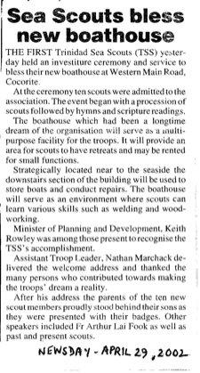 In 1944 a lease was obtained of a small piece of land on the sea front at Mucurapo. Immediately fund raising was started so that a "Club House" could be put up. Soon Father Kennedy's attention shifted from the building to the reclamation of the frontage as the sea continued to silt up in front of the slipway. This land reclamation was a Herculean task continued over many, many years. It could be discouraging work as the sea continually washed away the fill, but nevertheless the land crept ever further seaward. When Father Murray took over the Troop, officially in 1973, he was faced with a deteriorating building and also undertook the task of extending further seaward and consolidating the gains already made.